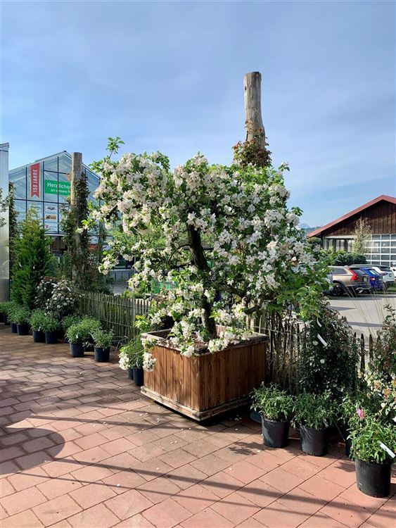 Ungefähr 20 Jahre alt, überzeugt dieser 'Boskoop'-Solitär mit einer unglaublichen Blütenfülle und leckeren Früchten im Herbst. Seine Äste sind beinahe etagenförmig gewachsen und er eignet sich bestens für kleinere Gärten oder grosse Gefässe. Mit seiner urchigen Gestalt eignet er sich für Kombinationen mit Gräsern oder lockeren Stauden.
