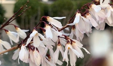 Die Schneeblüte (Abeliophyllum distichum) ist ein zarter Frühjahrsblüher, für lockere Bepflanzungen oder auf Mauerkronen. Sie verzaubert karge, laublose Ecken in edle Blütenparadieschen! Mit Zwiebelpflanzen wie Krokus oder Narzissen kann die Schneeblüte (Abeliophyllum distichum) besonders schön kombiniert werden. Die jungen Triebe sind ganz dunkelrot und verleihen dem wunderschönen Strauch einen extra-Kontrast. Einer der schönsten, filigranen Frühjahrsblüher.