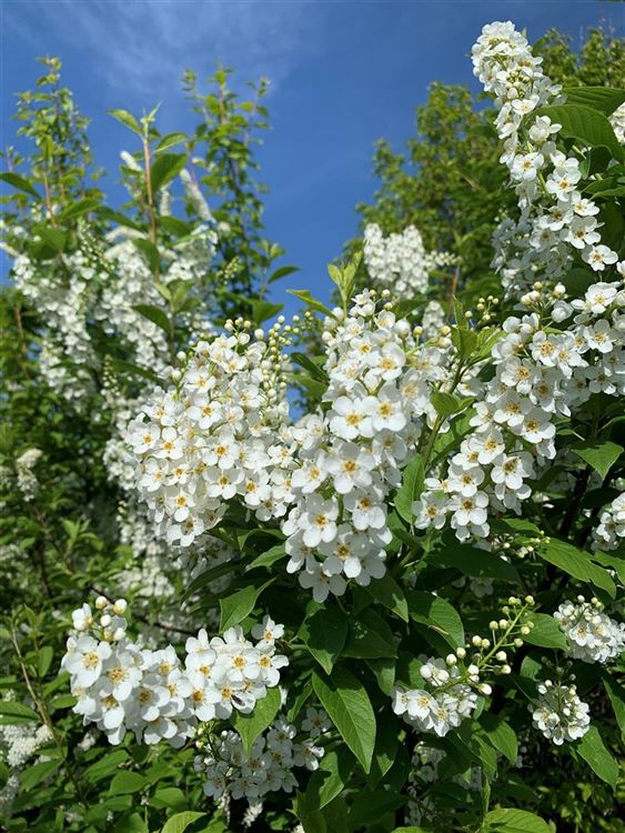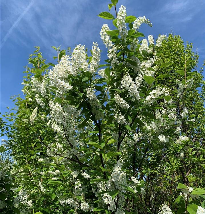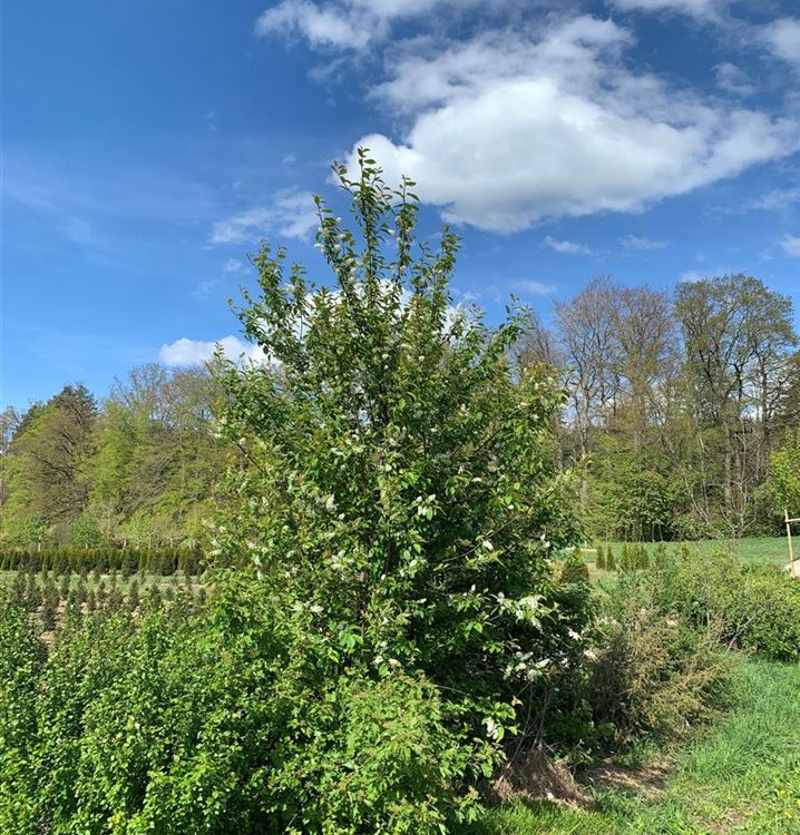 Ein grosser Strauch, der richtige Stämme bildet! Die Traubenkirsche (Prunus padus) wächst rasch zu einem ansehnlichen Gehölz heran und trägt reichlich duftende Blüten. Für gemischte Hecken, in denen er auch etwas grösser werden darf. Von trockeneren Standorten bis zu eher feuchten Standorten ist die Traubenkirsche (Prunus padus) sehr anpassungsfähig. Sogar zeitweilige Überflutung wird in der Regel ertragen.
