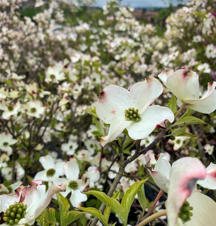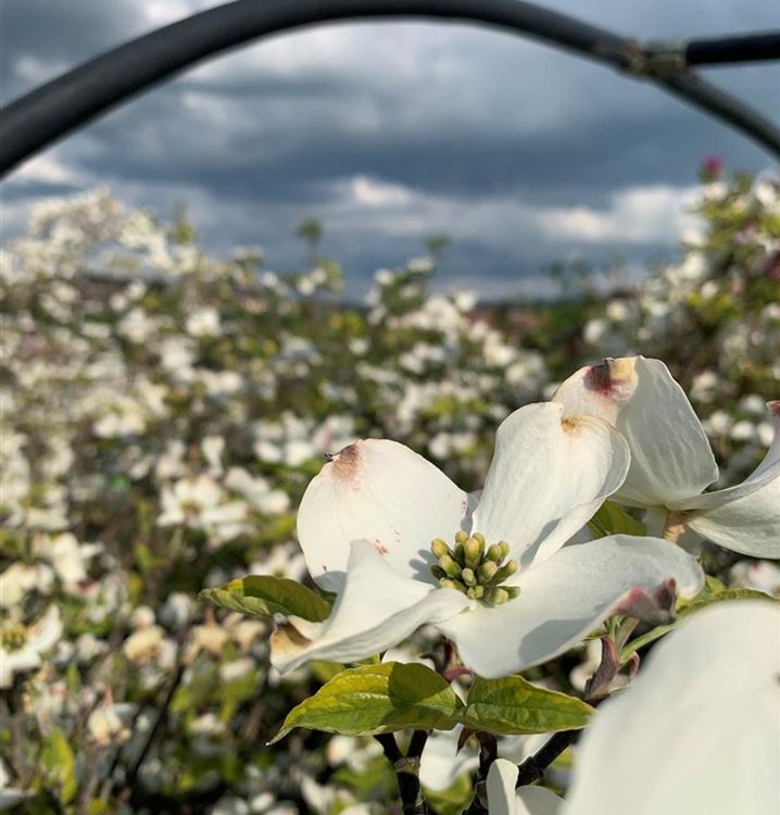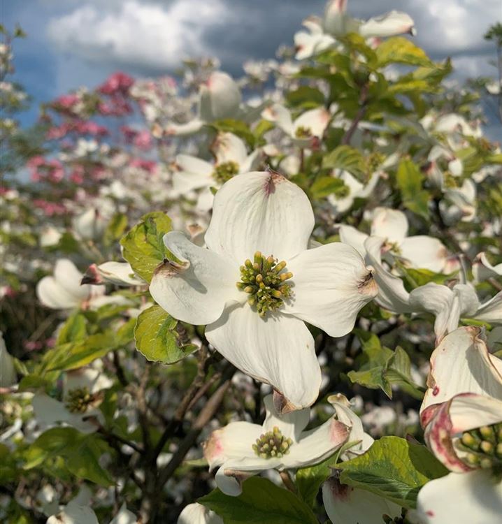Der Amerikanische Blumen-Hartriegel 'Rainbow' (Cornus florida) ist ein ausladender, breit wachsender Grossstrauch mit dekorativen, ovalen Früchten. Die weissen Blüten erscheinen von Mai bis Juni.