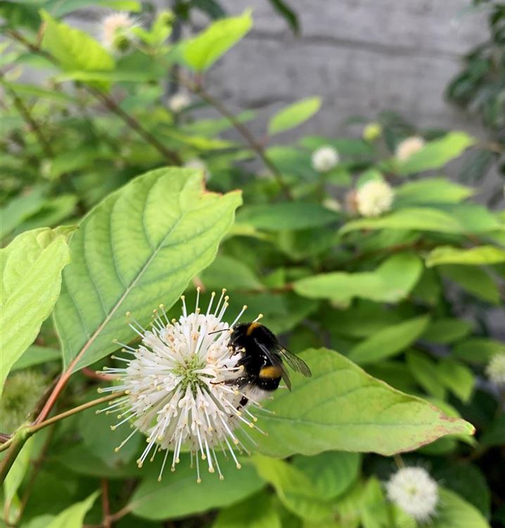 Mit seinen fantastischen Blütenkugeln sorgt der Knopfbusch anfangs Sommer für grosse Augen ! Die wunderschönen Blüten sind ein wahres Fest für Bienen und andere Insekten, die den Strauch in Scharen befliegen. Auch im Topf macht der Cephalanthus eine tolle Figur!