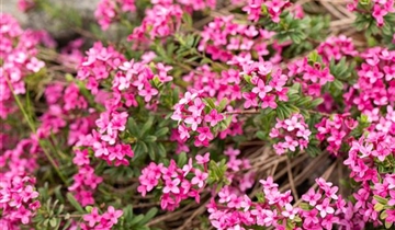 Der Rosmarinseidelbast (Daphne cneorum) ist ein flacher Zwergstrauch. An einem sonnigen bis halbschattigen Standort mit durchlässigem Boden erreicht er gewöhnlich eine Höhe von ca. 40 cm und wird ca. 80 cm breit.