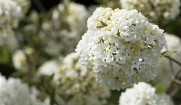 Der Schneeball 'Eskimo' (Viburnum) ist ein buschiger, aufrechter Kleinstrauch, der cremeweisse, in Trugdolden angeordnete Blüten mit einem starken Duft hervorbringt. Sie erscheinen von April bis Mai. Bei richtiger Pflege blüht der Schneeball 'Eskimo' erneut im Oktober. An einem sonnigen bis halbschattigen, windgeschützten Standort mit durchlässigem, nährstoffreichem Boden erreicht er gewöhnlich eine Höhe von ca. 1,5 m und wird ca. 1,5 m breit.