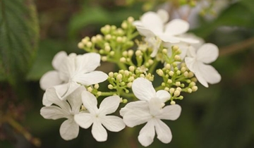 Der Gefüllte Schneeball 'Watanabe' (Viburnum plicatum) ist ein aufrechter, breiter, rundlicher Kleinstrauch, der weisse, in Trugdolden angeordnete Blüten mit einem starken Duft hervorbringt. Sie erscheinen von Juli bis August. Bei richtiger Pflege blüht der Gefüllte Schneeball 'Watanabe' erneut von Oktober bis November. An einem sonnigen bis halbschattigen Standort mit humosem, nährstoffreichem Boden erreicht er gewöhnlich eine Höhe von ca. 2 m und wird ca. 1,8 m breit.
