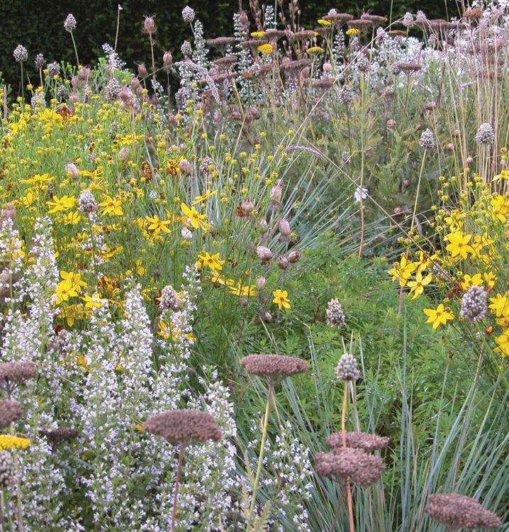 Eine Pflanzenkomposition der Emotionen, sinngemäss «vom Winde verweht»: Kristall-kühles Himmelsblau von Glockenblumen und Steinquendel, zerfliesst im Silbergrün des Blaustrahlhafers und warmem, erdendem Gelb des Mädchenauges: Prärie oder Steppe – der Sommerwind weckt die Sehnsucht. Und bricht mit edler Leichtigkeit die oft strenge Raumarchitektur unserer Zeit!