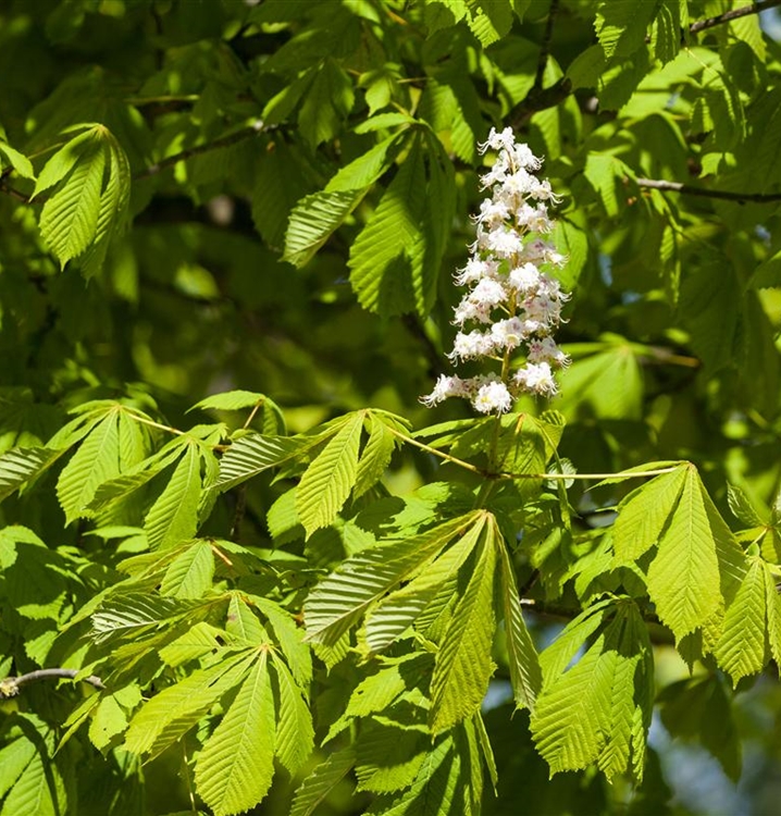 Die Gefülltblühende Rosskastanie 'Baumannii' (Aesculus hippocastanum) ist ein rundlicher, malerischer, aufrechter Grossbaum, der weisse, in Rispen angeordnete Blüten hervorbringt. Sie erscheinen von Mai bis Juni. Ihre Rinde ist dunkelgrau, schuppenförmig. An einem sonnigen bis halbschattigen Standort mit durchlässigem, nährstoffreichem Boden erreicht sie gewöhnlich eine Höhe von ca. 25 m und wird ca. 20 m breit.