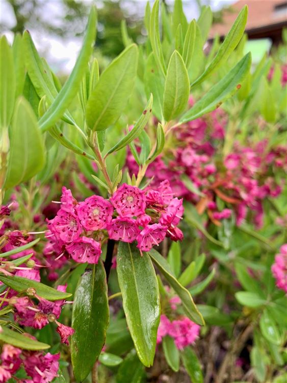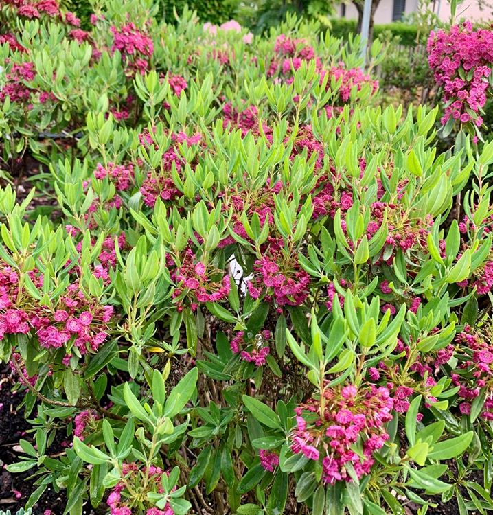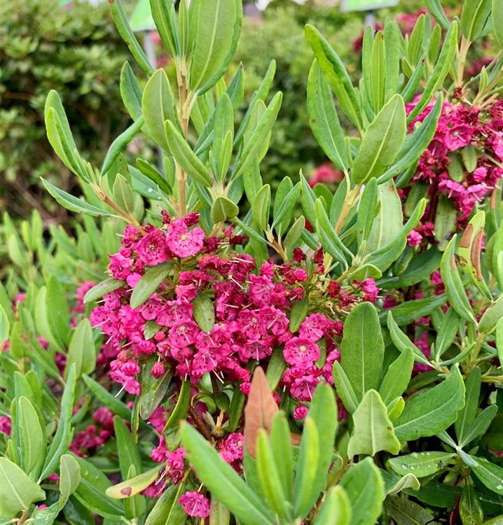 Das Rote Lorbeerröslein 'Rubra' (Kalmia angustifolia) ist ein aufrechter, buschiger, breiter Kleinstrauch, der purpurrote, schalenförmige Blüten hervorbringt. Sie erscheinen von Juni bis Juli. An einem sonnigen bis halbschattigen Standort mit humosem, Boden erreicht es gewöhnlich eine Höhe von ca. 1 m und wird ca. 1,2 m breit.