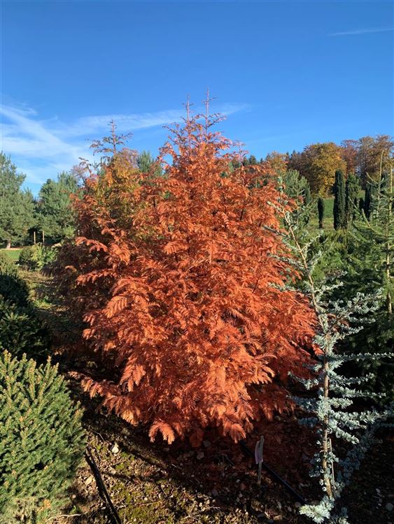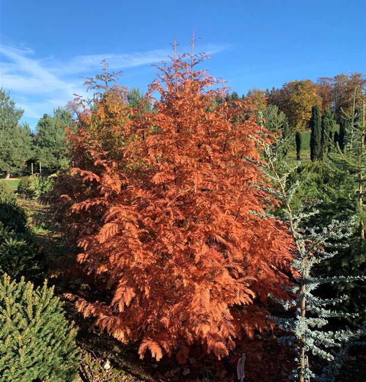 Das Chinesische Rotholz (Metasequoia glyptostroboides) ist ein Grossbaum, welcher kegelförmig wächst und gewöhnlich eine Höhe von ca. 40 m und eine Breite von ca. 10 m erreicht. Seine nadelförmigen Blätter haben eine mittelgrüne Färbung. Sie verwandeln sich im Herbst in ein leuchtendes Kupferbraun oder Gelb-rot. Dieses Gehölz ist gut frostverträglich. Es bevorzugt humosen Boden in sonniger bis halbschattiger Lage.