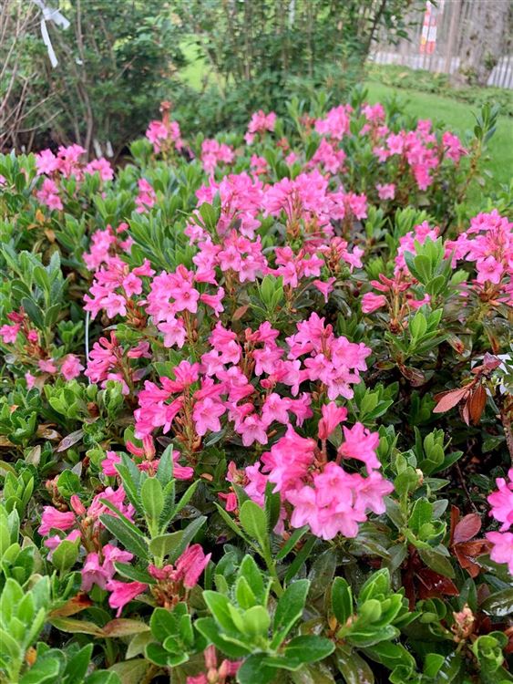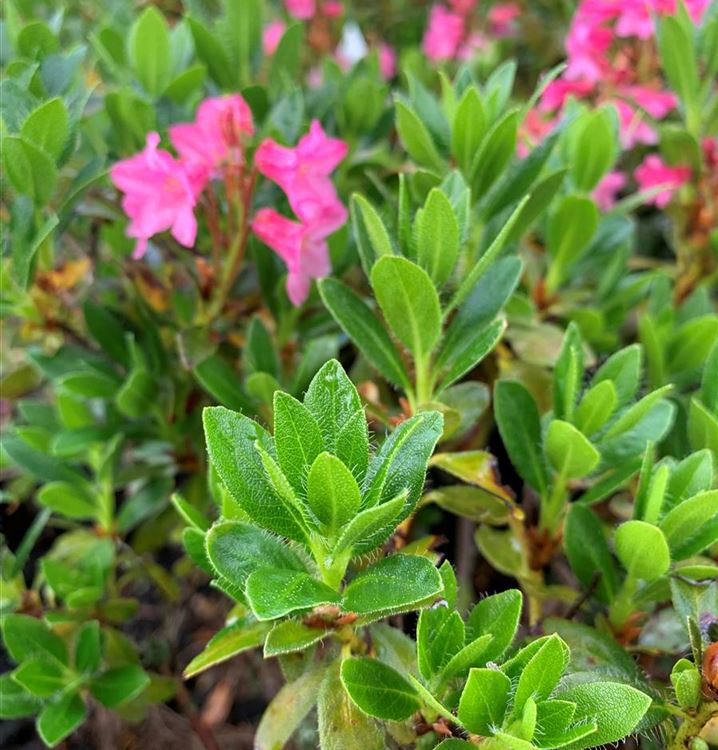 Der Rhododendron hirsutum (Rhododendron hirsutum) bringt von Ende Juni bis Anfang Juli ein wahres Blütenmeer in verschiedenen Farben (je nach Sorte) hervor. Dieses aufrecht, buschig, breit, kompakt wachsende Gehölz erreicht gewöhnlich eine Höhe von 60 - 80 cm und eine Breite von 0,8 bis 1,4 m. Ein halbschattiger (bis schattiger) Standort und ein lockerer Boden schaffen optimale Bedingungen für ein gesundes Wachstum. Der Rhododendron hirsutum ist frosthart, mag aber keine Kahlfröste.