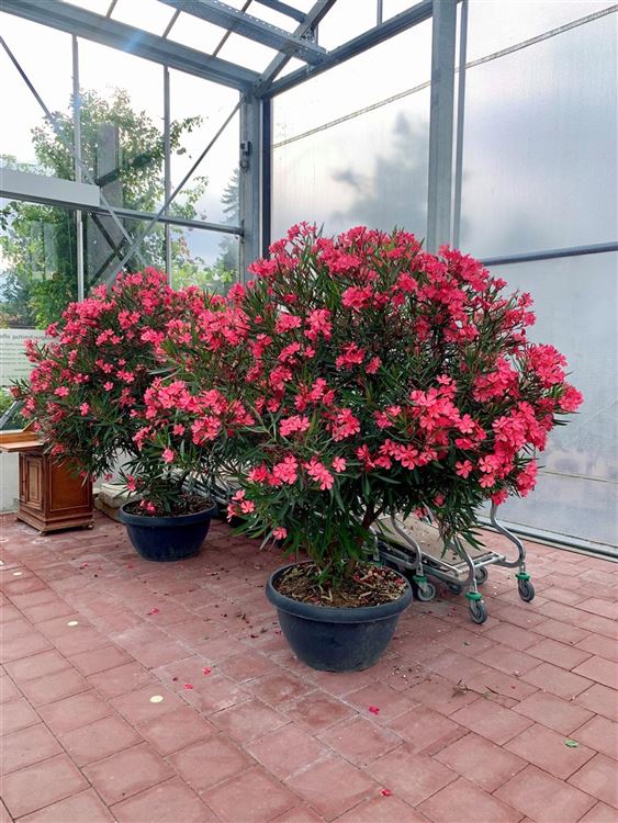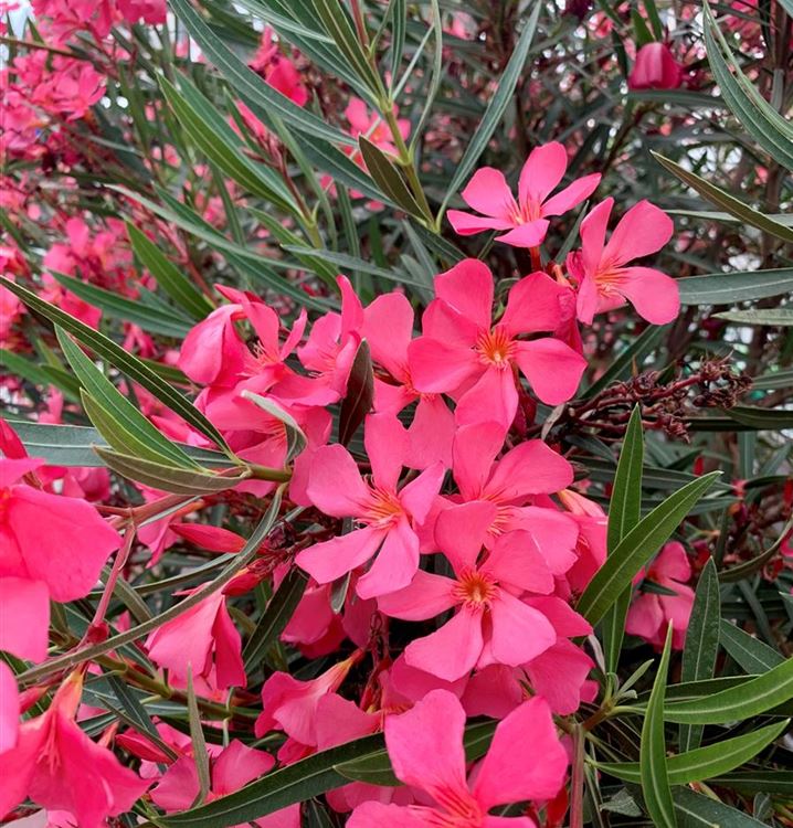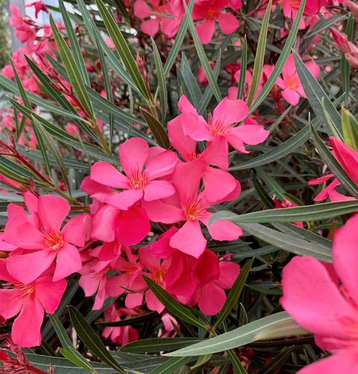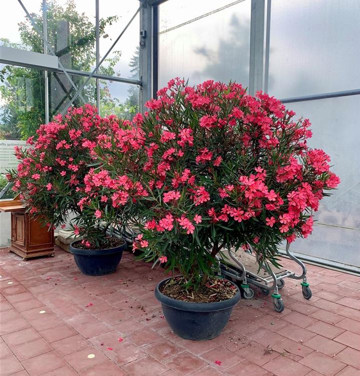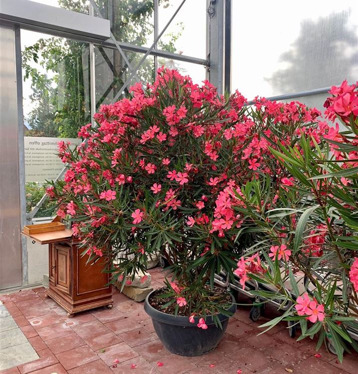 Der Oleander 'Rojo Red' (Nerium oleander) ist eine sehr beliebte, immergrüne Kübelpflanze. Seine rosaroten Blüten erscheinen von Juni bis September. Der Standort sollte möglichst sonnig und geschützt sein. Eine durchlässige und nährstoffreiche Erde ist dabei ideal. Bei günstigen Bedingungen erreicht der Oleander 'Rojo Red' eine Höhe von ca. 2 m und wird bis zu 1,8 m breit.
