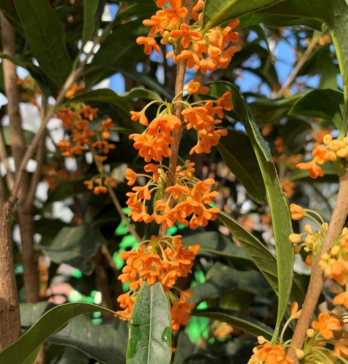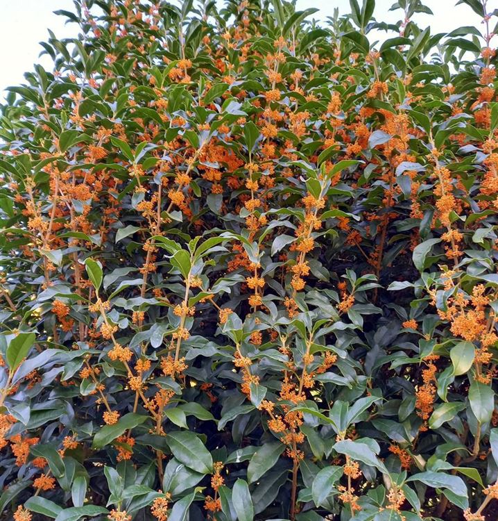 Die süsse Duftblüte (Osmanthus fragrans f. aurantiacus) mag ein sonniges oder halbschattiges Plätzchen. Sie eignet sich auch für Gefässe, wo sie einen prima Sichtschutz abgibt. Aus den Blüten des Osmanthus fragrans f. aurantiacus wird ein Duftstoff hergestellt.