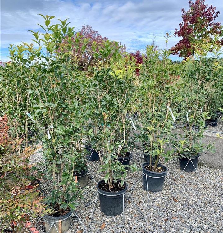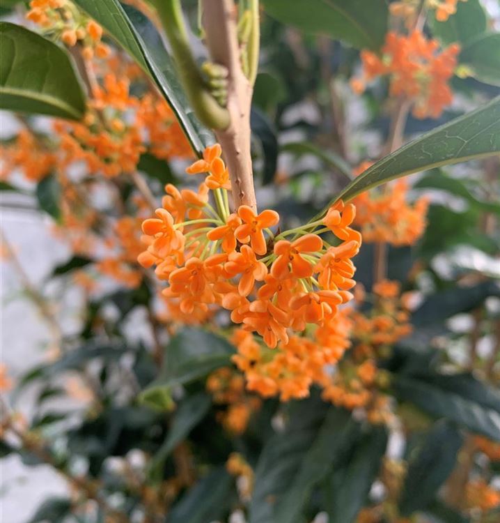 Ein grandioses Dufterlebnis für Ihren Garten! Mit der späten Blüte im Oktober verzaubert die Orange Duftblüte (Osmanthus fragrans f. aurantiacus) auch trübe Herbststimmungen. Unter dem immergrünen Blätterkleid leuchten die orangen Blüten von Osmanthus fragrans f. aurantiacus besonders schön. Sie mag es warm und geschützt, ist an milden Standorten komplett hart, exponiert oder im Kübel aber froh, um einen leichten Winterschutz.