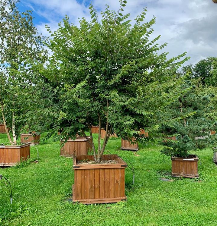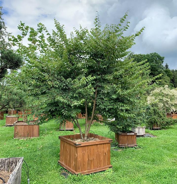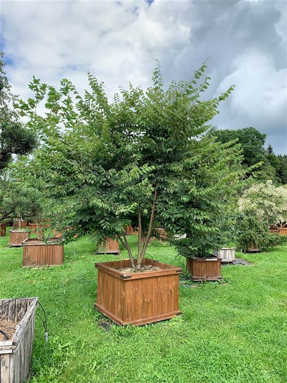 Die Japanische Zelkove (Zelkova serrata) ist ein ausladender, breiter Grossbaum, der grünbraune Blüten hervorbringt. Sie erscheinen von April bis Mai. Zudem trägt die Japanische Zelkove, spitz eiförmige, dunkelgrüne Blätter. Ihre Rinde ist grau, schuppenförmig. An einem sonnigen bis halbschattigen Standort mit nährstoffreichem Boden erreicht sie gewöhnlich eine Höhe von ca. 25 m und wird ca. 22 m breit.