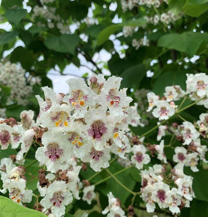 Der Trompetenbaum (Catalpa bignonioides) ist ein rundlicher Baum, der weisse, in Rispen angeordnete Blüten hervorbringt. Sie erscheinen von Juni bis Juli. Aus diesen gehen braune, schotenförmige Kapseln hervor. Sie sind gross. Zudem trägt der Trompetenbaum, herzförmige, mittelgrüne Blätter. Seine Rinde ist dunkelgrau, längsgefurcht.