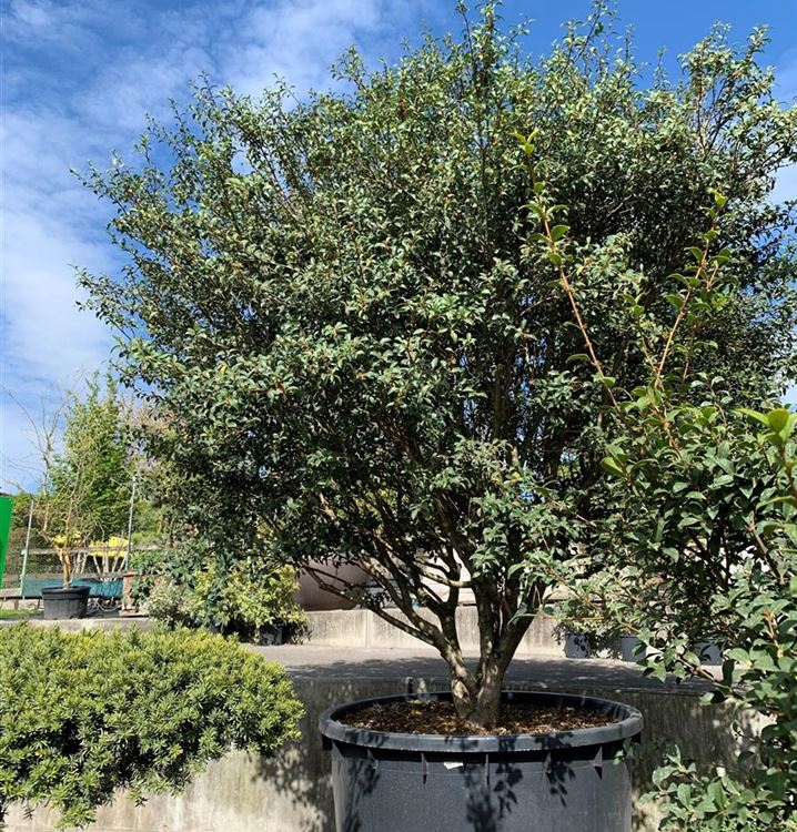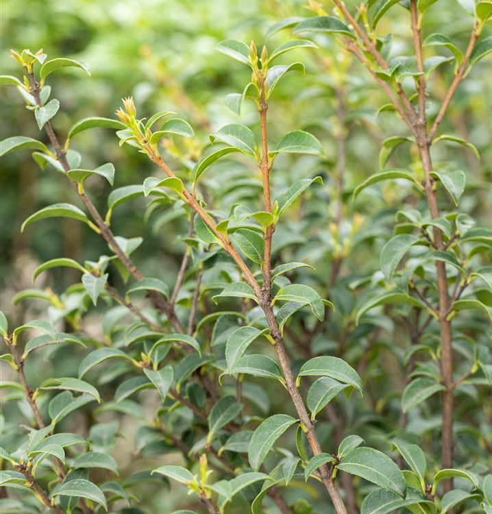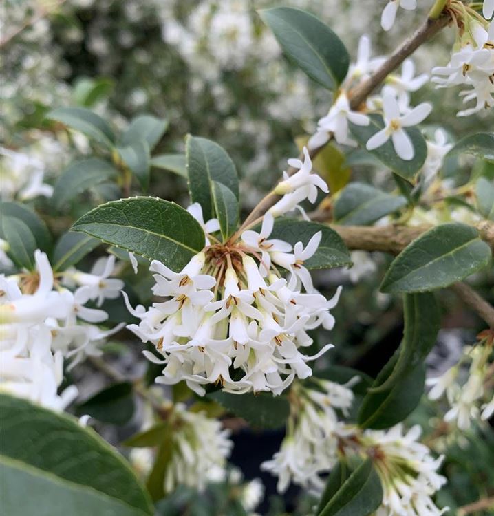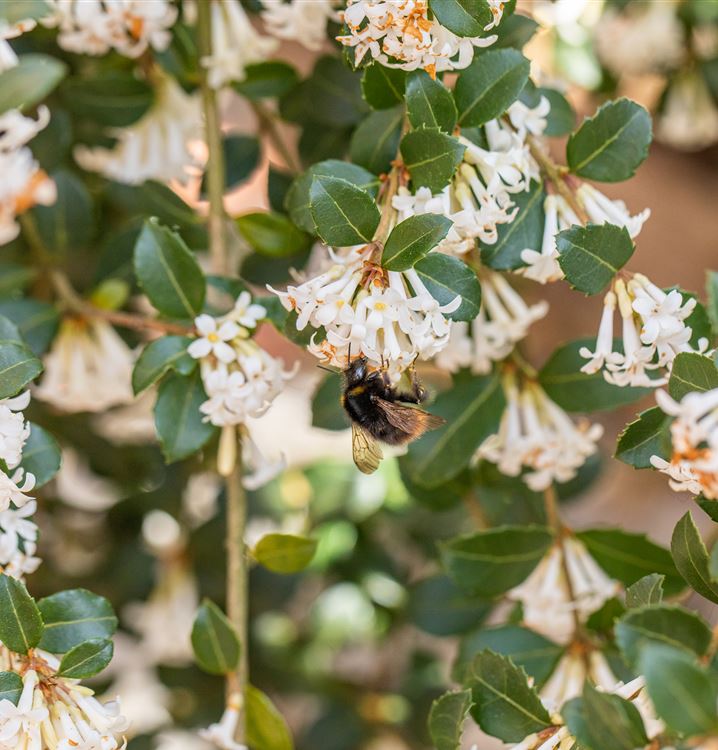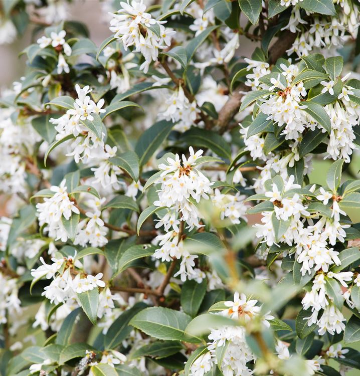 Die Burkwoods Duftblüte (Osmanthus burkwoodii) ist ein buschiger, breiter Grossstrauch, der weisse Blüten mit einem starken Duft hervorbringt. Sie erscheinen von April bis Mai. Zudem trägt die Burkwoods Duftblüte, glänzende, eiförmige, dunkelgrüne Blätter. An einem halbschattigen bis schattigen, windgeschützten Standort mit durchlässigem, humosem Boden erreicht sie gewöhnlich eine Höhe von ca. 5 m und wird ca. 5 m breit.