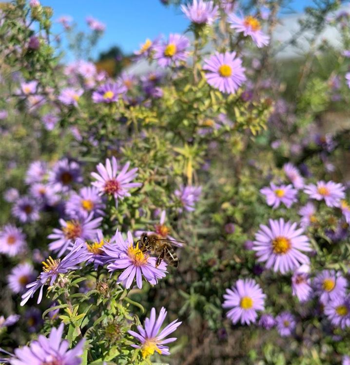 • die Blüten von Aster x amethystinus 'Freiburg' werden stark von Bienen, Hummeln und Schwebfliegen angeflogen