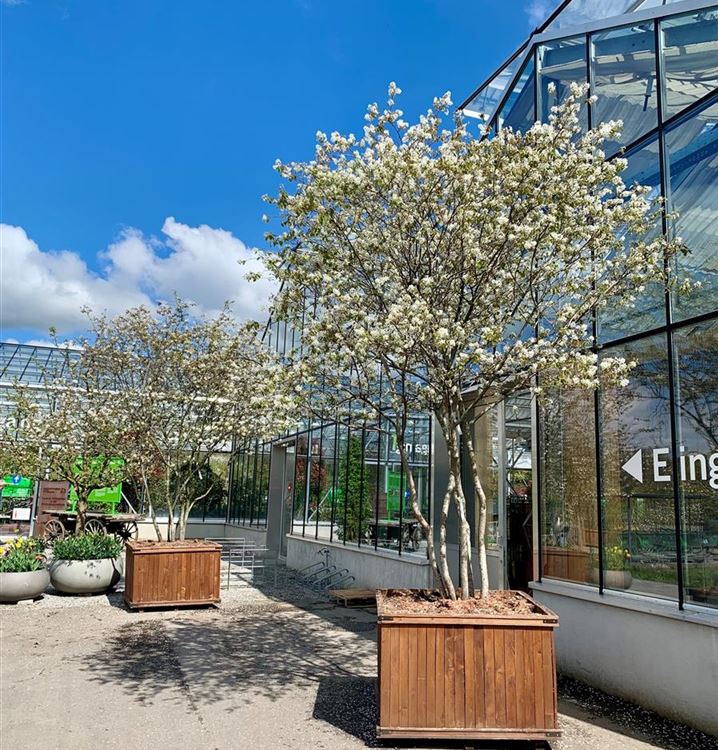 Die Kupfer-Felsenbirne (Amelanchier lamarckii) ist ein aufrechter, mehrstämmiger Grossstrauch, der weisse Blüten hervorbringt. Sie erscheinen von April bis Mai. Aus diesen gehen ab Juni dunkelblaue, runde Früchte hervor. Sie sind klein. Zudem trägt die Kupfer-Felsenbirne, eiförmige, mittelgrüne Blätter. Der kupferorange Austrieb ist ebenso ein interessanter Anblick. An einem sonnigen bis halbschattigen Standort mit durchlässigem, humosem Boden erreicht sie gewöhnlich eine Höhe von ca. 8 m und wird ca. 8 m breit.