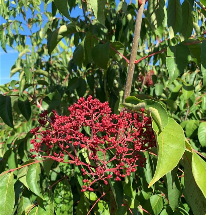 Als kleiner bis mittelgrosser Baum passt der Bienenbaum (Tetradium daniellii var. hupehensis) mit seinen gefiederten, eschenartigen Blättern in den Hausgarten oder in die wilde Baumgruppe. Er wächst recht locker, bildet aber dennoch eine schöne Krone. Besonders dienlich sind die üppigen, filigranen Blüten, die im August und September eine reich beflogenen Nahrungsquelle für Bienen und Schwebfliegen sind!