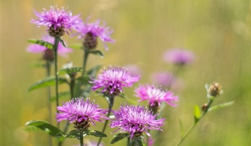Die Wiesen-Flockenblume (Centaurea jacea) ist eine aufrechte, horstbildende Staude, die von Juni bis September purpurrote, tellerförmige Blüten bildet. Bis zu 40 verschiedene Wildbienen fliegen ihre Blüten an. Ihre matten, lanzettlichen, gezähnten Blätter sind mittelgrün. An einem sonnigen Standort mit sandigem, lehmigem Boden erreicht sie gewöhnlich eine Höhe von ca. 60 cm und wird ca. 40 cm breit. Die Wiesen-Flockenblume ist gut frostverträglich.