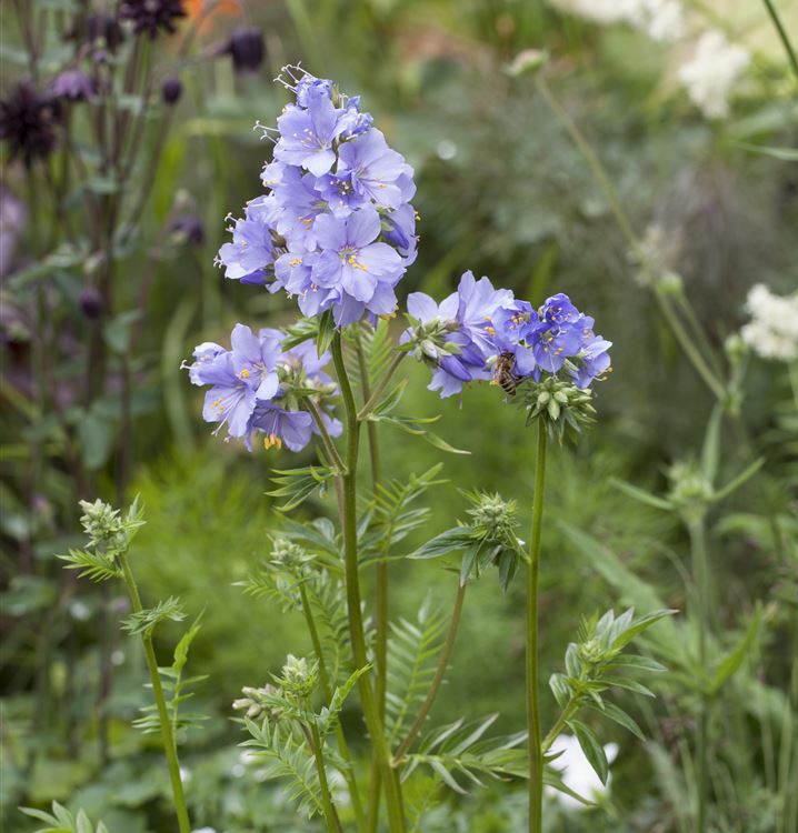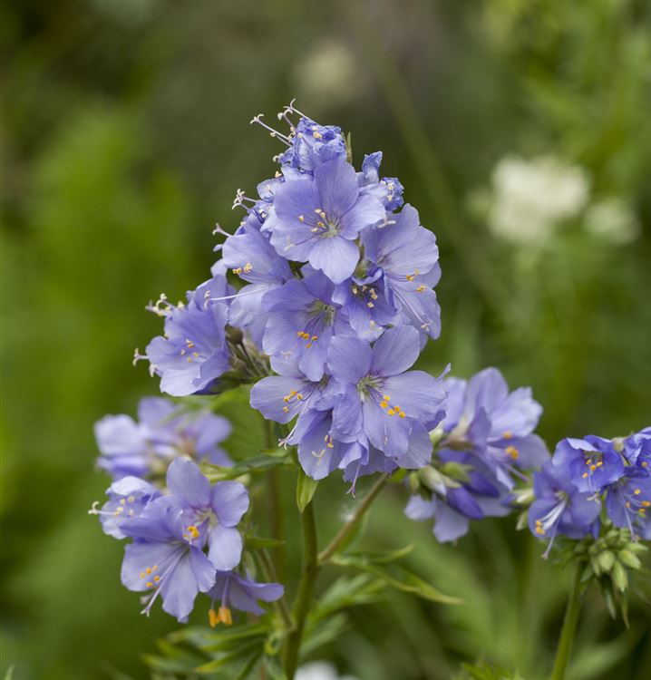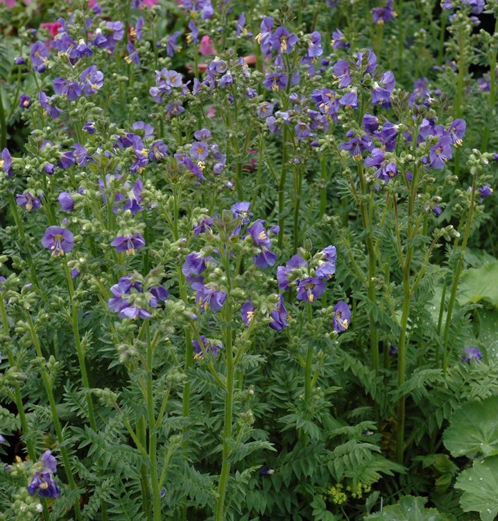 Die Blaublühende Jakobsleiter (Polemonium caeruleum) ist eine aufrechte Staude, die von Mai bis Juni blaue, trichterförmige Blüten mit einem angenehmen Duft bildet. Wiederholte Blüte kommt bei richtiger Pflege von Juli bis August vor. Ihre gefiederten Blätter sind mittelgrün. An einem sonnigen bis halbschattigen Standort mit humosem, nährstoffreichem Boden erreicht sie gewöhnlich eine Höhe von ca. 80 cm und wird ca. 40 cm breit. Die Blaublühende Jakobsleiter ist gut frostverträglich.