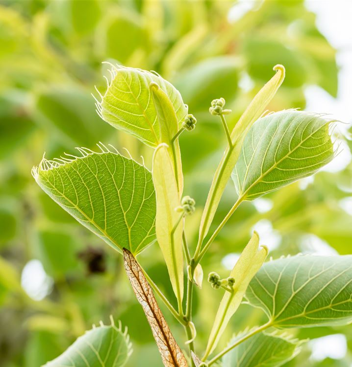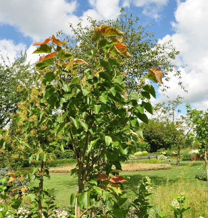 Die Bewimoerte Linde (Tilia henryana) ist ein aufrechter Kleinbaum, der cremeweisse Blüten mit einem starken Duft hervorbringt. Sie erscheinen von August bis September und werden fleissig von Bienen und Hummeln angeflogen. Aus diesen gehen grau-grüne Früchte hervor. Zudem trägt die Bewimperte Linde, grosse herzförmige, dunkelgrüne Blätter mit den typischen, feinen Wimpern (Grannen), die sich am Blattrand entlang ziehen. Der bronzefarbene Austrieb ist ebenso ein interessanter Anblick. Ihre Rinde ist grau, längsgefurcht. Sie ist einfach zu schneiden und