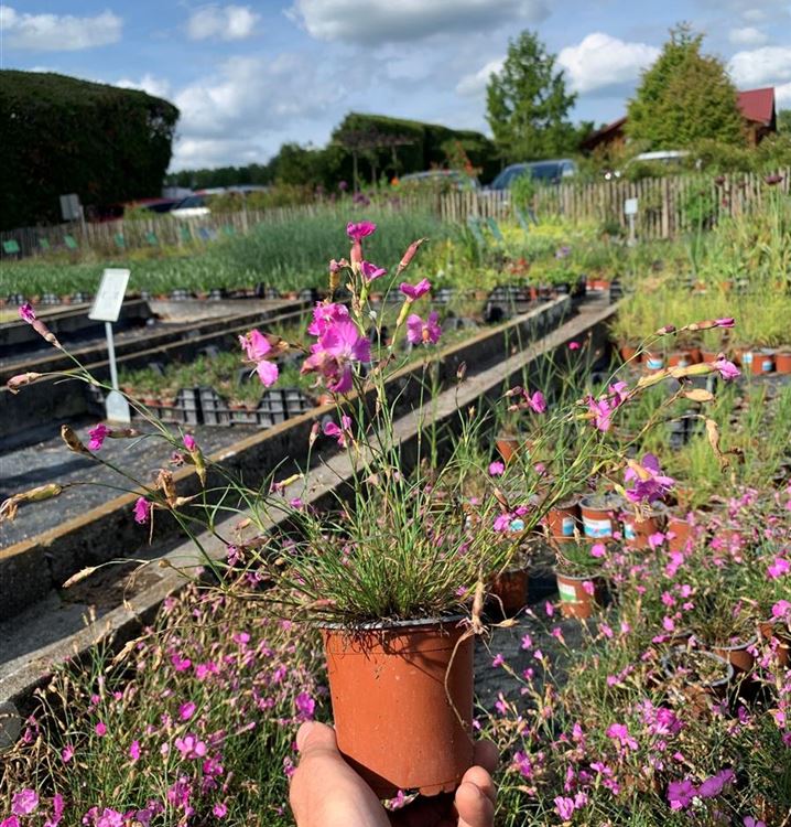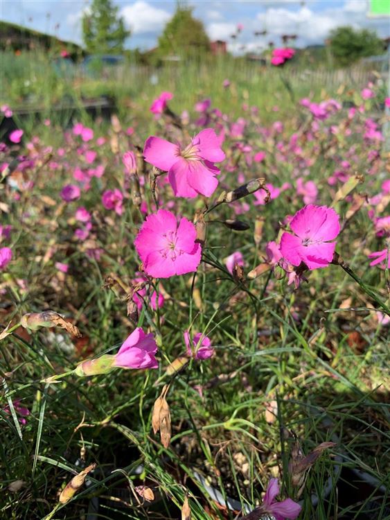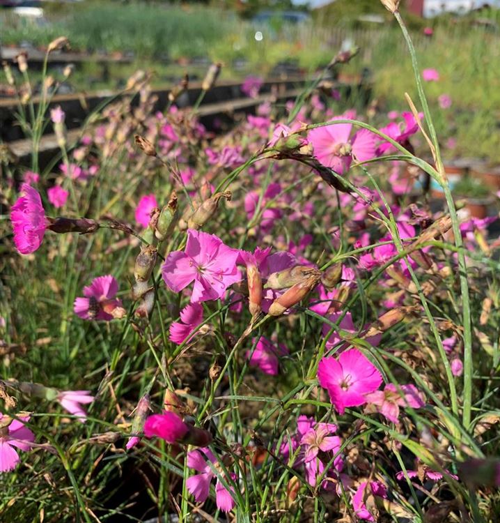 Die Stein-Nelke (Dianthus sylvestris) ist eine aufrechte, wintergrüne Staude, die von Juni bis Juli pinke, schalenförmige Blüten bildet. Ihre linealen Blätter sind grau-grün. An einem sonnigen Standort mit kalkhaltigem, trockenem Boden erreicht sie gewöhnlich eine Höhe von ca. 40 cm und wird ca. 20 cm breit. Die Stein-Nelke ist gut frostverträglich.
