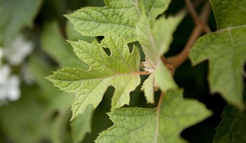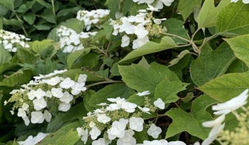 Eine der grösseren Hortensien: Die eichblättrige Hydrangea quercifolia besticht mit ihrem wunderschönen Laub und robustem Wuchs! Bis in den Herbst leuchten ihre weissen Blüten aus saftigem Grün, bis sich die Blätter blut - purpurrot färben!