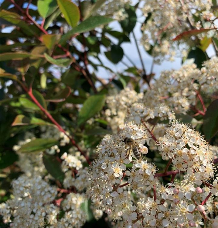 • die Blüten von Photinia fraseri 'Red Robin' werden stark von Bienen, Hummeln und Schwebfliegen angeflogen