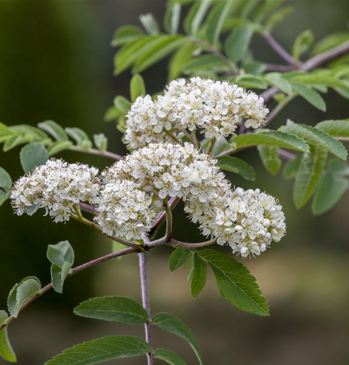 Die Echte Vogelbeere (Sorbus aucuparia) ist ein robuster Zier- und Wildbaum, der mit seiner weissen Blüte im Frühjahr und den orange-roten Beeren im Spätsommer nicht nur optisch begeistert, sondern auch als wertvolle Vogelnährpflanze dient. Der frostharte Baum wächst auf 6 bis 12 Meter Höhe, bildet eine breit-eiförmige Krone und eignet sich hervorragend für Gärten, Naturhecken oder als Solitär. Seine dekorativen Früchte sind roh leicht giftig, jedoch gekocht vielseitig verwendbar – etwa für Gelee, Likör oder Wildgerichte. Standort: sonnig bis halbschattig, normaler Boden. Ideal für naturnahe Pflanzungen und ökologisch wertvolle Gärten in der Schweiz.