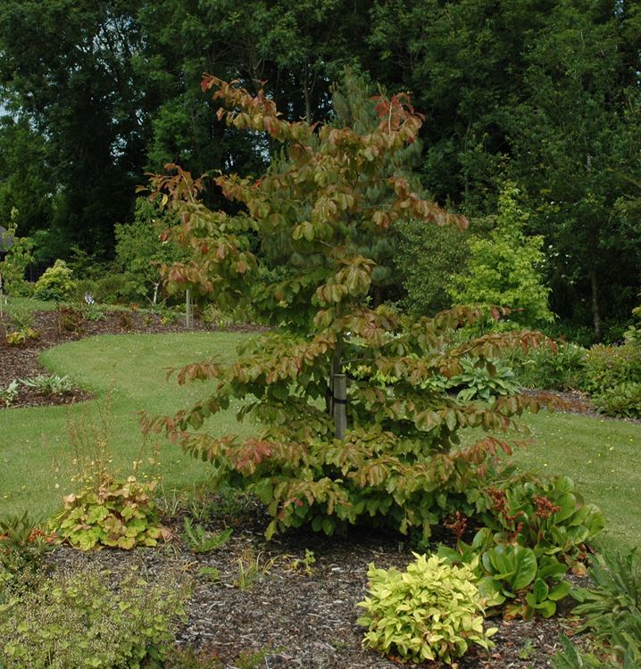 Der Eisenbaum (Parrotia persica) ist ein breiter, mehrstämmiger Grossstrauch, der orange-rote, sternförmige Blüten hervorbringt. Sie erscheinen von März bis April. Aus diesen gehen grünbraune Kapseln hervor. Zudem trägt der Eisenbaum, ledrige, rundliche, mittelgrüne Blätter. Der grün-rote Austrieb ist ebenso ein interessanter Anblick. Seine Rinde ist dunkelbraun, abblätternd. An einem sonnigen bis halbschattigen Standort mit durchlässigem, lehmigem Boden erreicht er gewöhnlich eine Höhe von ca. 10 m und wird ca. 10 m breit.