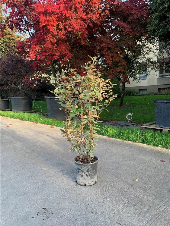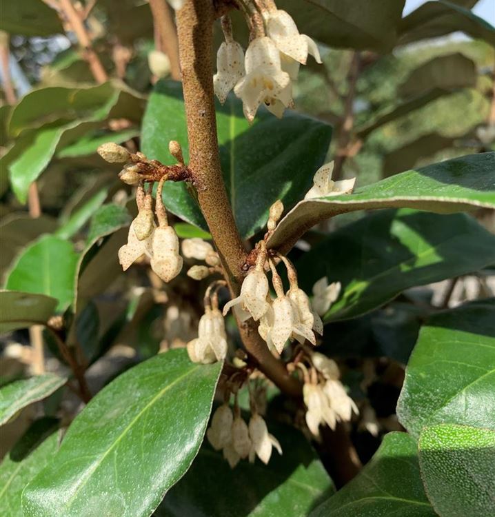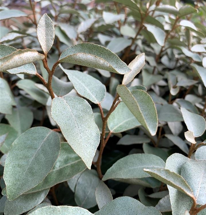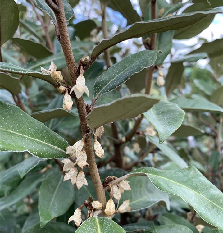 Immergrüner Strauch mit silbrig-grünem Laub, 2–3 m hoch, ideal als Hecke oder Sichtschutz. Sie wächst reich verzweigt, bleibt von Natur aus dicht und bietet mit ihren spitz zulaufenden Trieben zusätzlichen Schutz – auch für nistende Vögel. Spätblühend im September–November mit duftenden, insektenfreundlichen Blüten. Liefert kleine, rötliche, essbare Früchte, beliebt bei Vögeln. Anspruchslos, sonnig bis halbschattig. Verträgt Trockenheit, schnittfreundlich, meidet Staunässe. Dank der Symbiose mit Strahlenbakterien (Frankia alni) verbessert sie den Stickstoffgehalt im Boden, besiedelt auch nährstoffarme Standorte und benötigt weniger Dünger. Geeignet für Einzelstellung oder Gruppenpflanzung, auch für nährstoffarme Böden dank Stickstoffbindung.