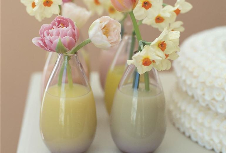 • Mit einem Tropfen Lebensmittelfarbe im Vasenwasser setzen Sie in einer Glasvase oder bei Blüten, die in einer Schale schwimmen, einen zusätzlichen farblichen Akzent