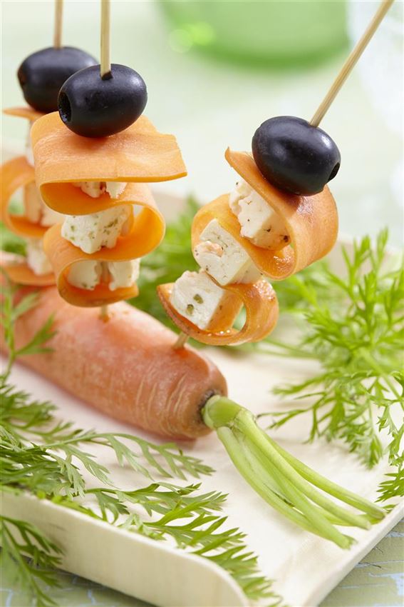 Fetakäse in kleine Würfel schneiden und die Oliven abwaschen. Dann wird alles auf die Spiesse verteilt, auf jeden Spiess steckt man einen Karottenstreifen, drei Fetawürfel und eine Olive.